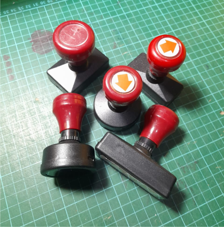 Praktis karena bisa langsung dipakai tanpa stampad. Sudah terisi tinta dengan pilihan warna hijau, biru, ungu, merah, hitam, kuning, oranye, cokelat, pink, abu-abu. Desain suka-suka/ custom.